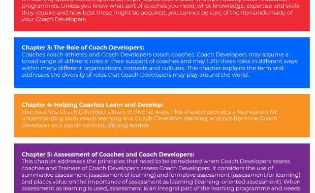 Außerdem im Anhang findet sich die kurze Broschüre Building Your Coach Developer Workforce. Diese richtet sich an die Führungskräfte von Organisationen, die Trainer*innen beschäftigen oder ausbilden. Sie zeigt die Bedeutung von Ausbilder*innen bei der Entwicklung von Trainer*innen zum Nutzen von Sportler*innen und Athlet*innen aller Altersgruppen, Motivationen und Fähigkeiten .