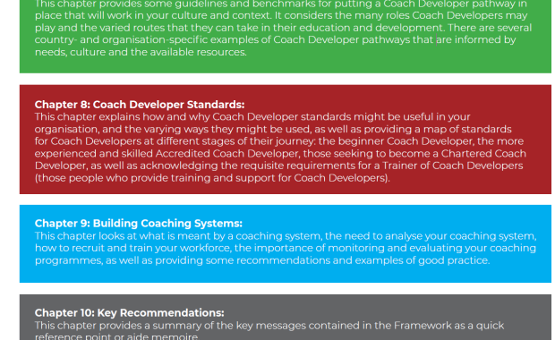 Das ICCE hat die zweite Version des International Coach Developer Framework (in englisch) herausgegeben. Die erste Version wurde bereits 2014 veröffentlicht, als der Begriff "Coach Developer" noch nicht sehr gebräuchlich war und zahlreiche Trainerausbildungsprogramme noch auf die Vermittlung von Wissen z.B. technischer und taktischer Art begrenzt waren. Die erste Ausgabe von 2014 sollte daraufhin eine Struktur zu schaffen, um die handelnden Personen und Institutionen bei der Ausbildung und Entwicklung von Trainerausbilder*innen zu unterstützen.