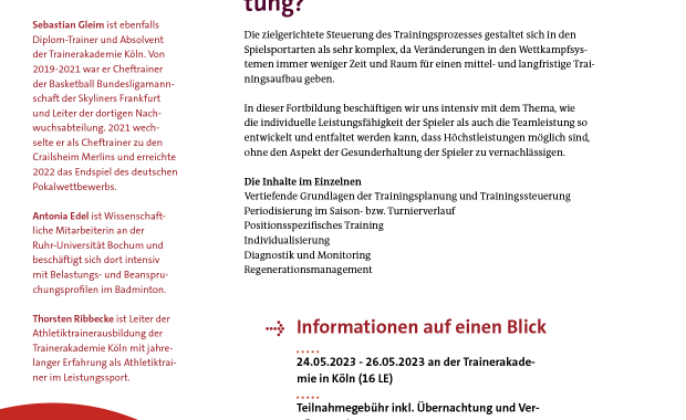 In dieser Fortbildung beschäftigen wir uns intensiv mit dem Thema, wie die individuelle Leistungsfähigkeit der Spieler als auch die Teamleistung so entwickelt  und entfaltet werden kann, dass Höchstleistungen möglich sind, ohne den Aspekt der Gesunderhaltung der Spieler zu vernachlässigen.