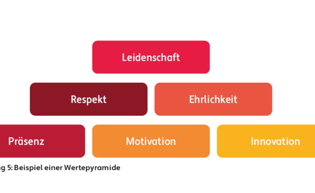 • Wertepyramide (Abbildung 5): Diese Übung dient dazu, die eigenen Werte zu überdenken und in eine persönliche Reihenfolge zu bringen. Die Studenten sollen zunächst individuell überlegen, welche sechs Werte ihnen (besonders) wichtig sind. Jeweils einen Wert schreiben sie auf eine Karteikarte. Im zweiten Schritt sollen sie die sechs Werte in eine Reihenfolge bringen. Dabei werden die individuell auf Rang vier bis sechs gerankten Werte in die untere Ebene gelegt, die Werte auf Rang zwei und drei auf die mittlere Ebene und der subjektiv am höchsten gewichtete Wert auf die obere Ebene. Der Reiz einer solchen Wertepyramide im Gegensatz zu einer einfachen Auflistung liegt darin, dass die Werte der unteren Ebene immer noch unverzichtbar sind, wie das Bild einer Pyramide zeigt. Würde man unten einen Wert (= Baustein) entnehmen, würde die gesamte Pyramide zusammenbrechen. Es geht also im Trainerhandeln nicht darum, sich auf die Umsetzung des einen zentralen Wertes zu fokussieren, vielmehr müssen alle relevanten Werte Berücksichtigung finden.