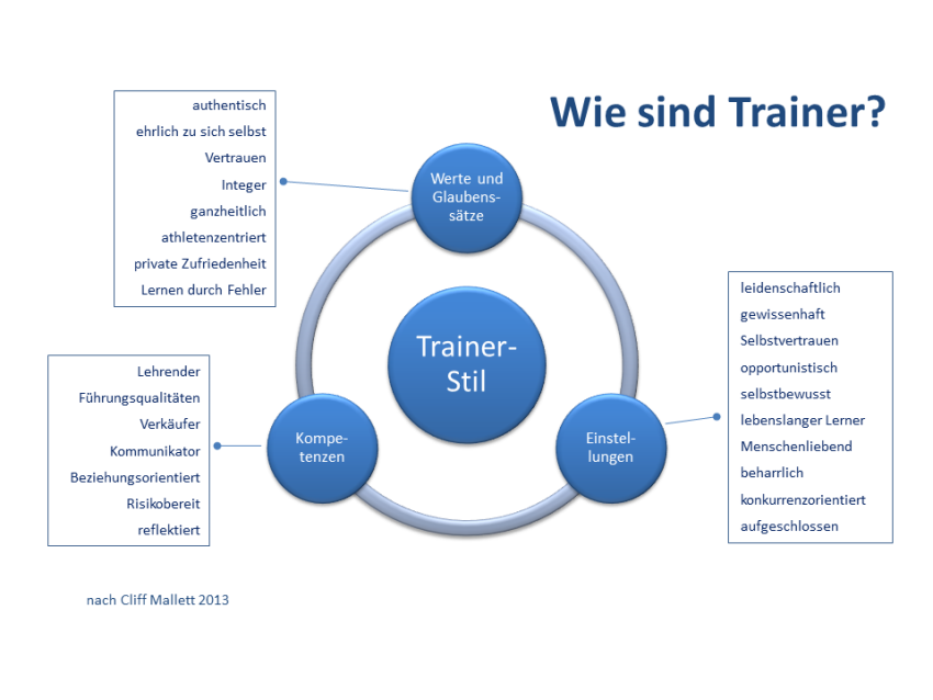 Beim letzten Treffen der Fachverbands-Koordinatoren an unserer Trainerakademie konnten wir kurzfristig Prof. Cliff Mallett (Universität Queensland, Australien) begrüßen. Er stellte erste vorläufige Ergebnisse der ICCE-Studie „Serial Winning Coaches“ vor. Einbezogen in die Untersuchung waren 14 Trainer aus neun Ländern, die mit ihren Athleten oder Teams über einen längeren Zeitraum oder mit verschiedenen Athleten bzw. Teams Medaillen auf Weltniveau gewinnen konnten (hier: über 150 Medaillen bei Olympischen Spielen oder Weltmeisterschaften).
