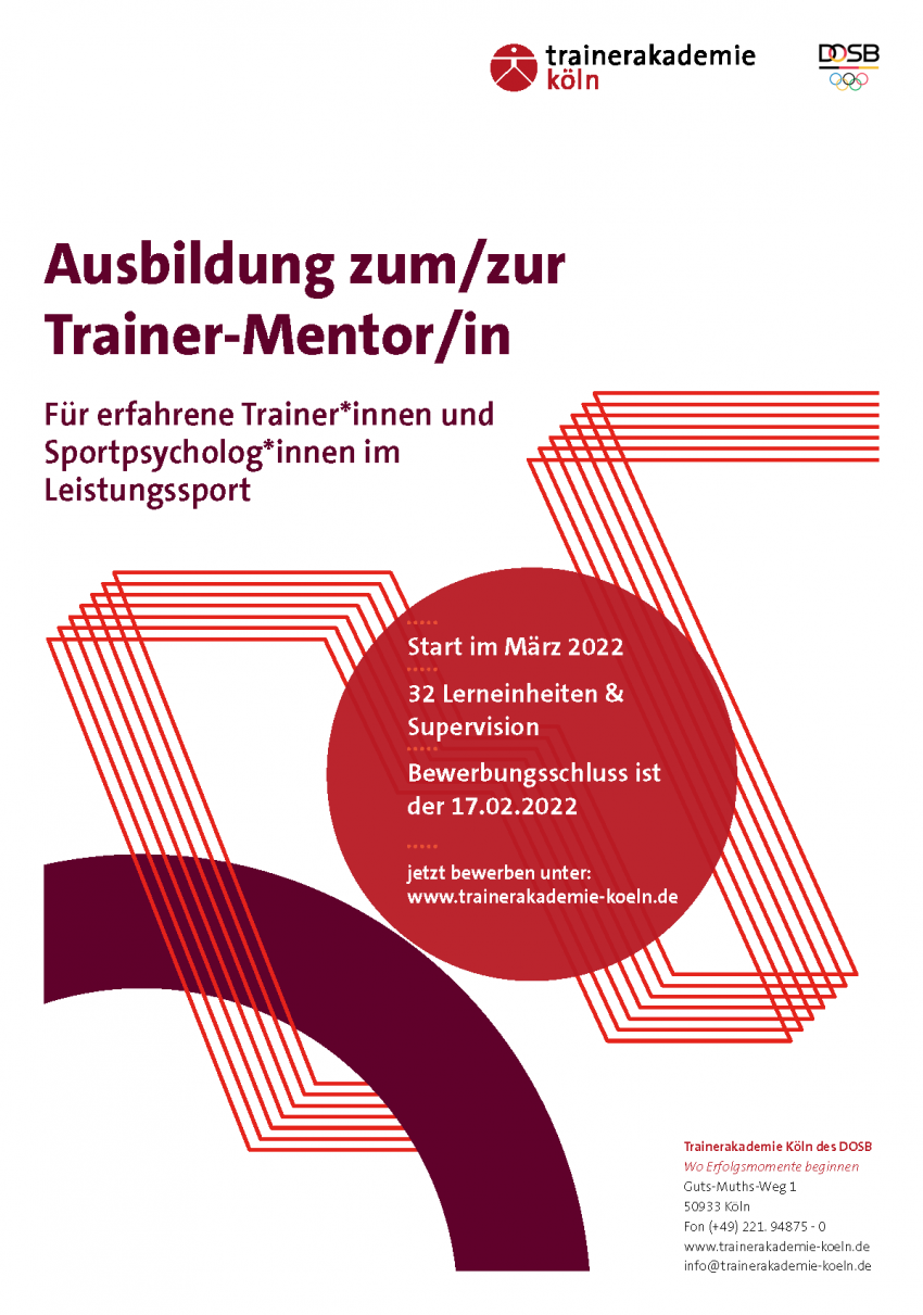 Die Ausbildung zur Trainermentor*in 2022 der Trainerakademie Köln des DOSB wendet sich an erfahrene Trainer*innen aller Sportarten sowie erfahrene Sportpsycholog*innen. Haben Sie Freude daran, ihre Erfahrungen und ihr Wissen im Rahmen einer 1:1-Beziehung weiter zu geben? Dann sind Sie hier richtig!