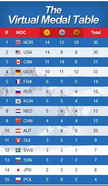 Demnach holt Deutschland 33 Medaillen und holt damit nach Norwegen (36) die meisten Medaillen. Wenn man nur die Goldmedaillen zählt würde Deutschland mit 10 x Gold auf dem vierten Rang landen.