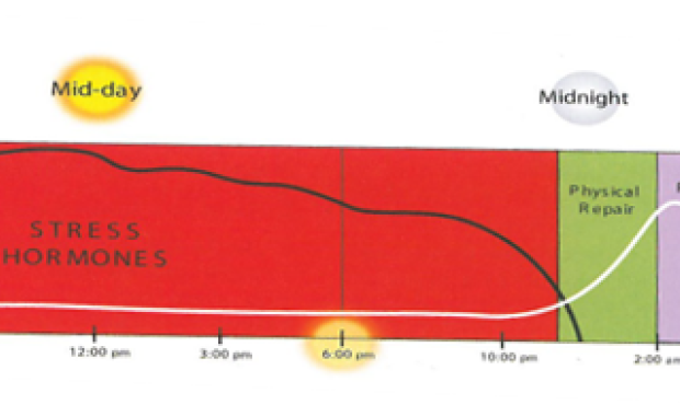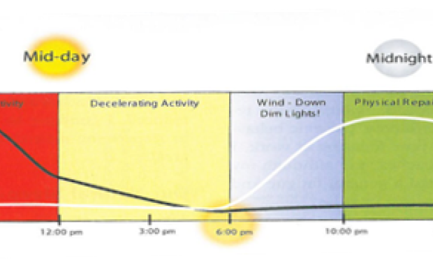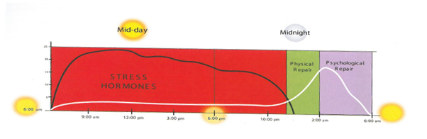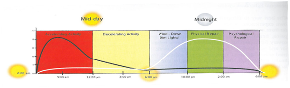 Der moderne Tag – Nacht – Rhythmus entspricht somit nicht mehr dem natürlichen Rhythmus. Helles Licht im Haus, Fernseher oder Computer bedeuten Stress. Das Licht eines Bildschirmes ist gleichzusetzen mit dem morgendlichen Sonnenlicht. Somit sinkt der Cortisolspiegel erst spät ab und verzögert die Freisetzung von Melatonin, Wachstumhormonen sowie den Aufbau der Immunabwehr. Ein Verzicht auf Fernseher oder Computer mindestens eine Stunde vor dem zu Bett gehen ist anzuraten. Geräusche die lauter als 70 dB (Geräusche einer mäßig befahrenden Straße) aktivieren ebenfalls das Nervensystem. Zu laute Geräusche in der Nacht beeinflussen die Schlaftiefe negativ und provozieren ein häufigeres Aufwachen. (siehe Schlafgrafik 2, Schreiner, 1995, Chek, 2013)