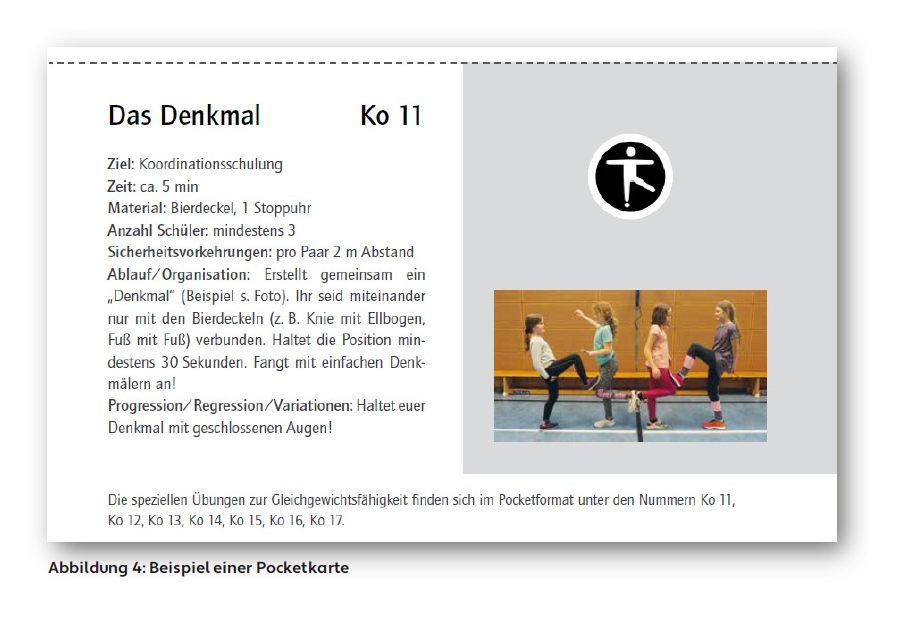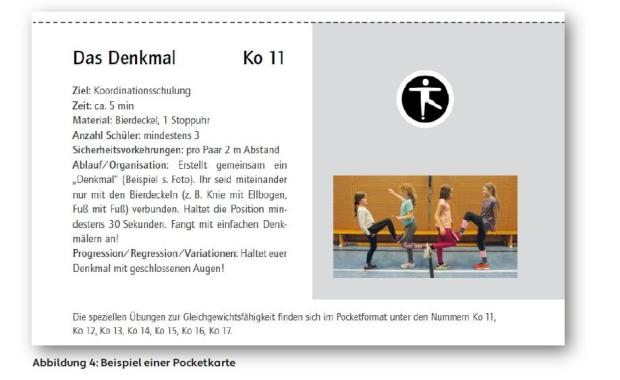 Ziel war es, dass die Lehrkraft eine Anleitung für die einzelnen Übungen mit in den Unterricht nehmen oder im Stationstraining den Kindern an den jeweiligen Stationen eine verständliche Anleitung auslegen kann. Dazu wurde das bekannte Format einer Pocketkarte gewählt. Auf dieser wird textlich und in Abbildungen oder Fotos die jeweilige Übung/das jeweilige Spiel dargestellt. Das gesamte zweite Buch „Pocketkarten für die Motorische Vielseitigkeitsausbildung als Voraussetzung für zukünftiges sportartspezifisches Training“ beinhaltet 730 Übungen auf 584 Seiten, welche in den Stundenplänen des ersten Buches durchnummeriert wurden. Alle Übungen auf den Pocketkarten (siehe Abbildung Pocketkarte) sind mit folgenden Punkten erklärt: