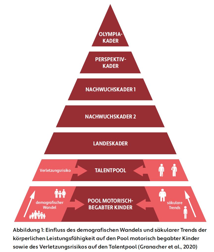 Der Sport im Allgemeinen und der Leistungssport im Speziellen sehen sich aktuell einer Vielzahl an Herausforderungen gegenüber. Eine abnehmende Geburtenrate (demografischer Wandel), die Entwicklungen von negativen säkularen Trends im Zusammenhang mit der körperlichen Leistungsfähigkeit von Kindern und Jugendlichen und schließlich eine hohe Verletzungsrate sind Treiber eines immer kleiner werdenden Pools an Kindern und Jugendlichen mit Potenzial, in ihrem Hochleistungsalter sportliche Spitzenleistungen zu erzielen (Granacher, Höhne, Puta & Büsch, 2020, S. 36; vgl. Abbildung 3).