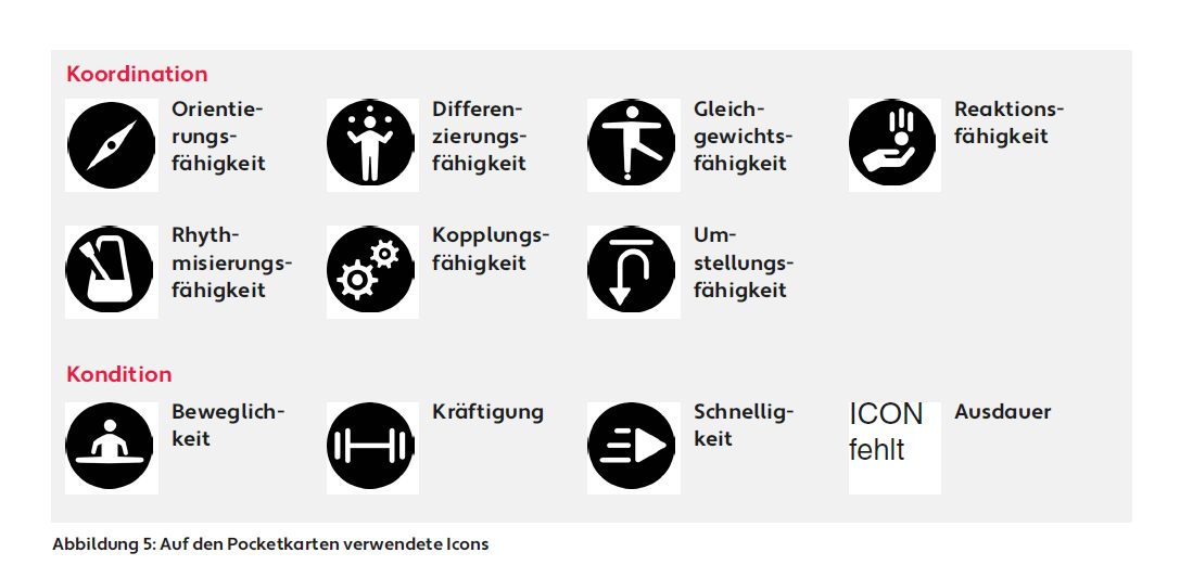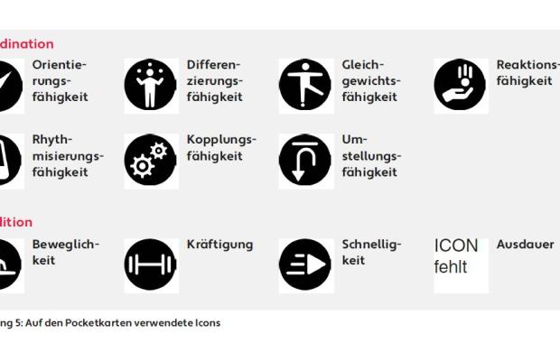 • Fertigkeit. Die Icons wurden wie in Abbildung Icon dargestellt eingepflegt. Zusätzlich sind die einzelnen Bereiche im Sportunterricht mit Farben codiert.