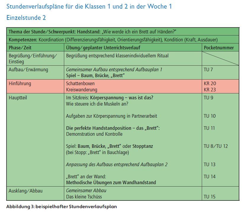 In der Erstellung dieses Werkes konnte jedoch nicht für jede Schule von einer Anordnung einer Doppel- zu einer Einzelstunde ausgegangen werden. Aus diesem Grund finden sich in den jeweiligen Bereichen Beispiele für drei Einzelstunden die Woche (siehe Abb. Stundenverlaufsplan).