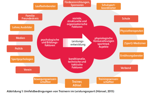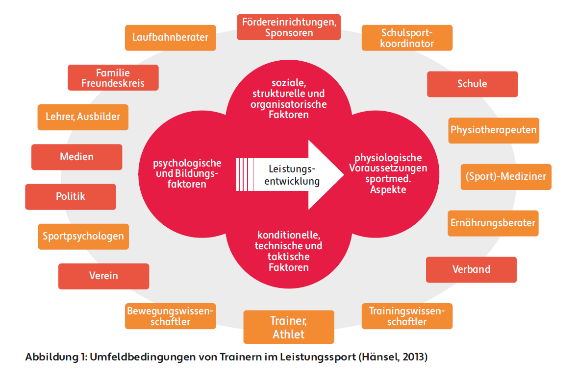 Als Trainer im Sport handelt man ständig. Ob nun im Austausch mit Verband, Verein oder Eltern, in der Organisation von Training und Wettkampf oder in der praktischen Arbeit mit den Athletinnen und Athleten. Und immer treffen wir dabei Entscheidungen (Finck, 2016). Der frühere Eishockey-Bundestrainer Uwe Krupp sprach in einem Vortrag vor Studenten der Trainerakademie einmal davon, dass Entscheidungen zu treffen die wichtigste Aufgabe eines Trainers sei. Aber wonach richten wir uns in unserem Handeln und bei unseren Entscheidungen? Von welchen Grundsätzen werden wir selbst dabei geleitet? Vielen Trainern ist das, bezogen auf die eigene Person, kaum bewusst. Zu bedenken ist jedoch: Je weniger Bewusstheit über die mich innerlich und äußerlich beeinflussenden Faktoren ich als Trainer habe, desto weniger werde ich in meinen Handlungen und Entscheidungen frei und gestaltend sein können. Vielmehr werde ich immer wieder von inneren ungeklärten Anteilen „getrieben“, ebenso werde ich in den vielfältigen Einflussfaktoren des Umfeldes nur schwerlich eine autonome, zu mir passende Position einnehmen können. Und von diesen Umfeldeinflüssen gibt es wahrlich eine Menge, wie Abbildung 1 zeigt.