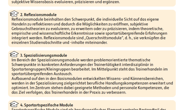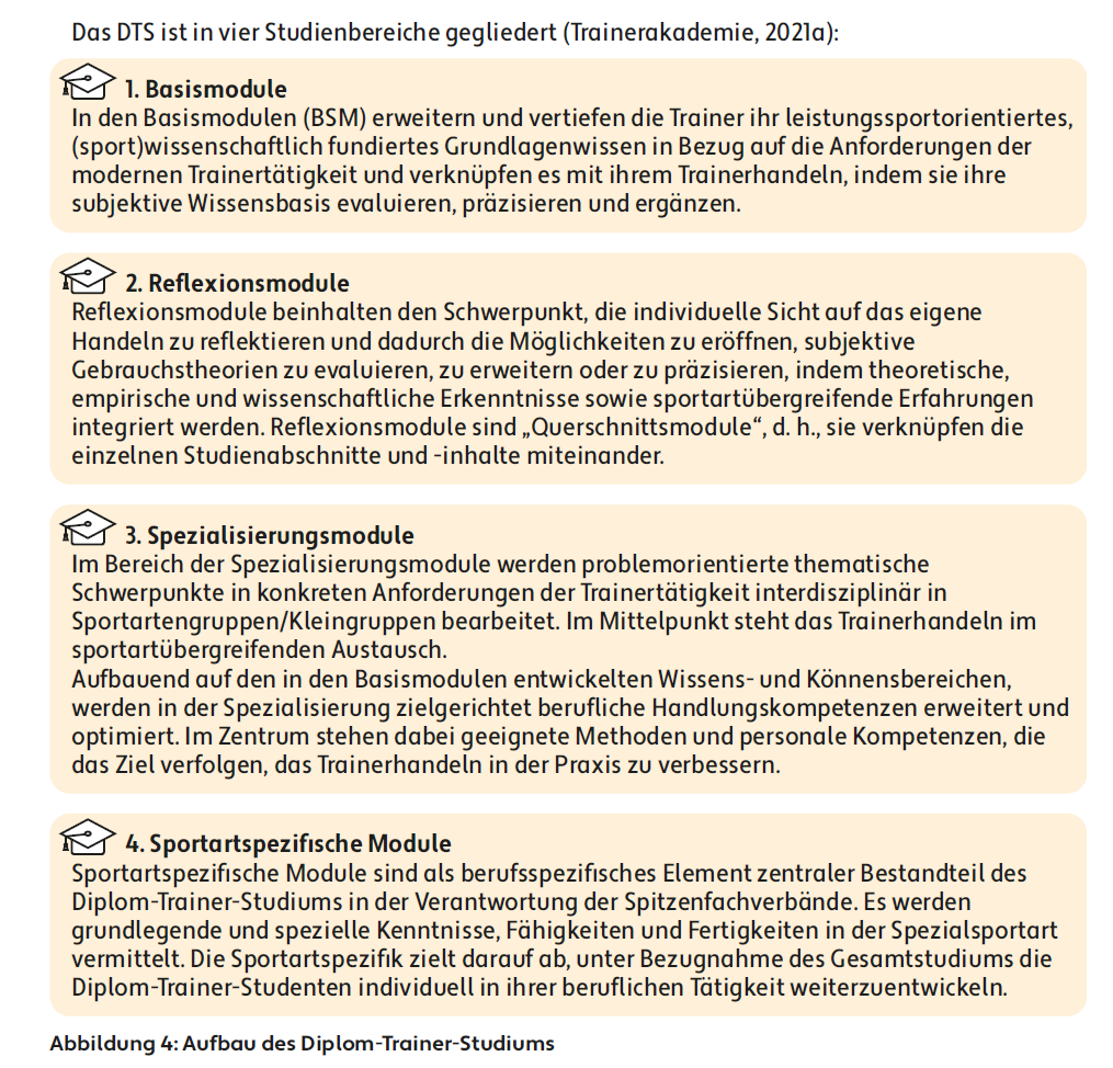 Die Erarbeitung einer individuellen Trainerphilosophie ist ein überdauernder Prozess, der als Schwerpunkt des Reflexionsmoduls RFM 4 (vgl. Abbildung 4) die Trainer während ihres dreijährigen Studiums begleitet (Trainerakademie, 2021b). Der didaktisch-methodische Aufbau des Reflexionsmoduls basiert auf folgenden Komponenten: