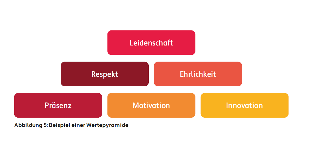 - Wertepyramide (Abbildung 5): Diese Übung dient dazu, die eigenen Werte zu überdenken und in eine persönliche Reihenfolge zu bringen. Die Studenten sollen zunächst individuell überlegen, welche sechs Werte ihnen (besonders) wichtig sind. Jeweils einen Wert schreiben sie auf eine Karteikarte. Im zweiten Schritt sollen sie die sechs Werte in eine Reihenfolge bringen. Dabei werden die individuell auf Rang vier bis sechs gerankten Werte in die untere Ebene gelegt, die Werte auf Rang zwei und drei auf die mittlere Ebene und der subjektiv am höchsten gewichtete Wert auf die obere Ebene. Der Reiz einer solchen Wertepyramide im Gegensatz zu einer einfachen Auflistung liegt darin, dass die Werte der unteren Ebene immer noch unverzichtbar sind, wie das Bild einer Pyramide zeigt. Würde man unten einen Wert (= Baustein) entnehmen, würde die gesamte Pyramide zusammenbrechen. Es geht also im Trainerhandeln nicht darum, sich auf die Umsetzung des einen zentralen Wertes zu fokussieren, vielmehr müssen alle relevanten Werte Berücksichtigung finden.